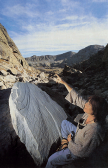 --Univers de pierres superbement déchiqueté par les mouvements de la Terre ou bien parfaitement lissé par le passage des glaciers... Ici sont des roches de schiste, vertes ou rouges gravées par la main de l’homme. Elles sont quelques fois dispersées entre les lacs bleus ou gris selon le temps où se reflètent les monts parsemés eux aussi de pétroglyphes.