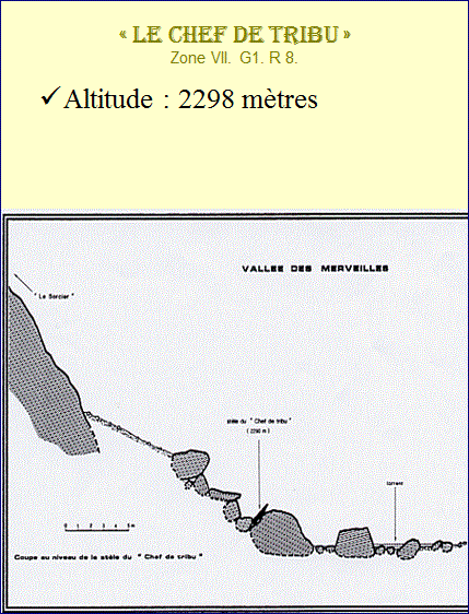 ---Le « Chef de Tribu » a été découvert par C. Bicknell et son ami Pollini, le 11 août 1909. Cette création de l’homme protohistorique sollicitant au premier abord une perception d’ordre esthétique est parmi les plus célèbres de toute la région du Bego. Mais tout objet peut être perçu esthétiquement et la plupart des objets pratiques peuvent aussi être considérés comme des œuvres d’art.