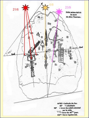 Les deux petits poignards opposés par le manche semblent dater du Chalcolithique ou du début du Bronze ancien. Les archéologues ont donc conclu que la stèle a été gravée vers 1800 avant J.-C.